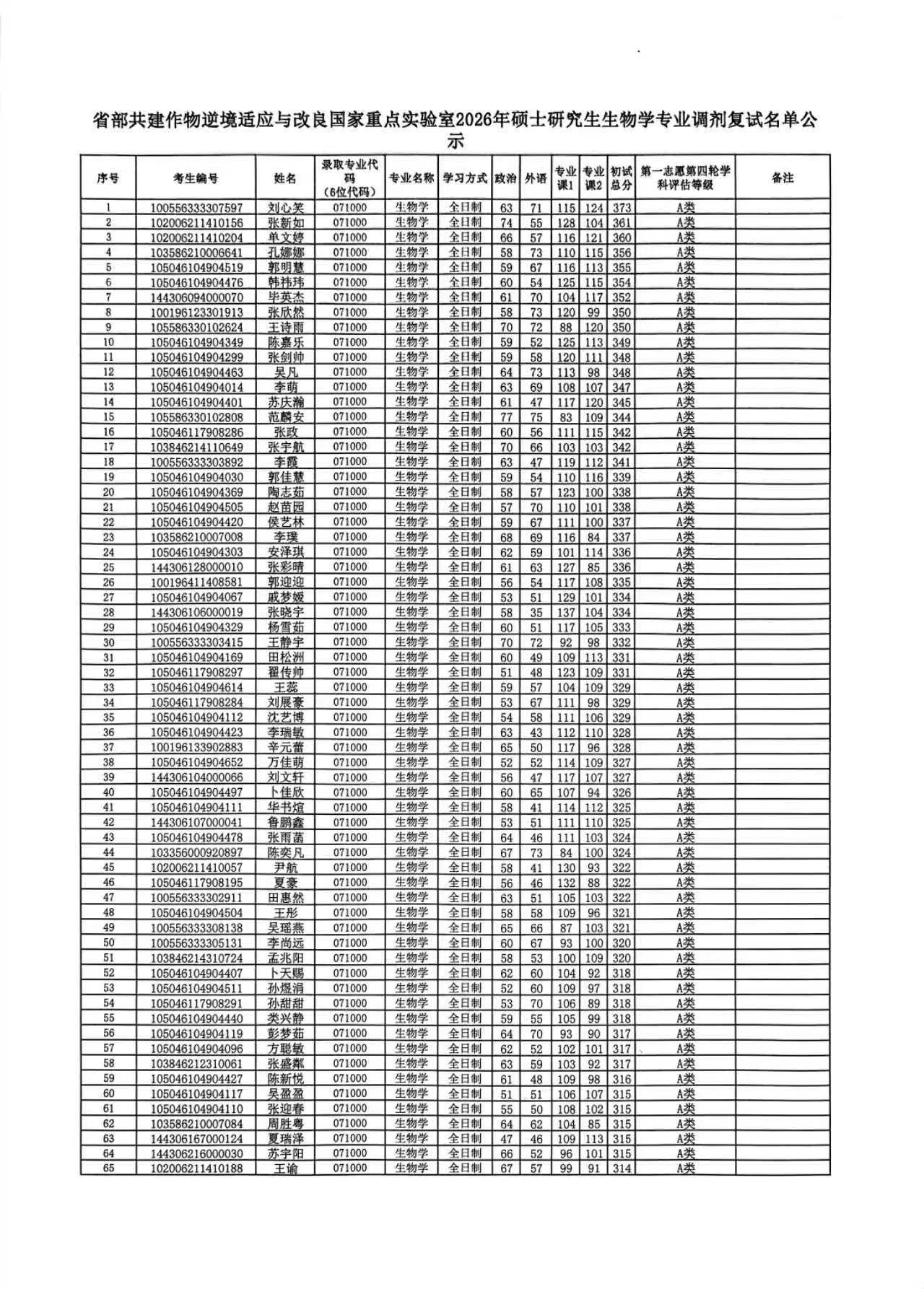 根据《河南大学省部共建作物逆境适应与改良国家重点实验室/棉花生物育种与综合利用全国重点实验室2026年硕士研究生招生调剂录取工作实施细则》,经研招网系统后台导出报名数据,按照规则产生复试名单,现将省部共建作物逆境适应与改良国家重点实验室2026年硕士研究生招生调剂复试名单公示如下: